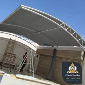• مظلات الشد: تتميز بمرونتها وقوتها وتناسب الأماكن الواسعة. (مظلات شد، مظلات شد انشائي، تركيب مظلات شد)